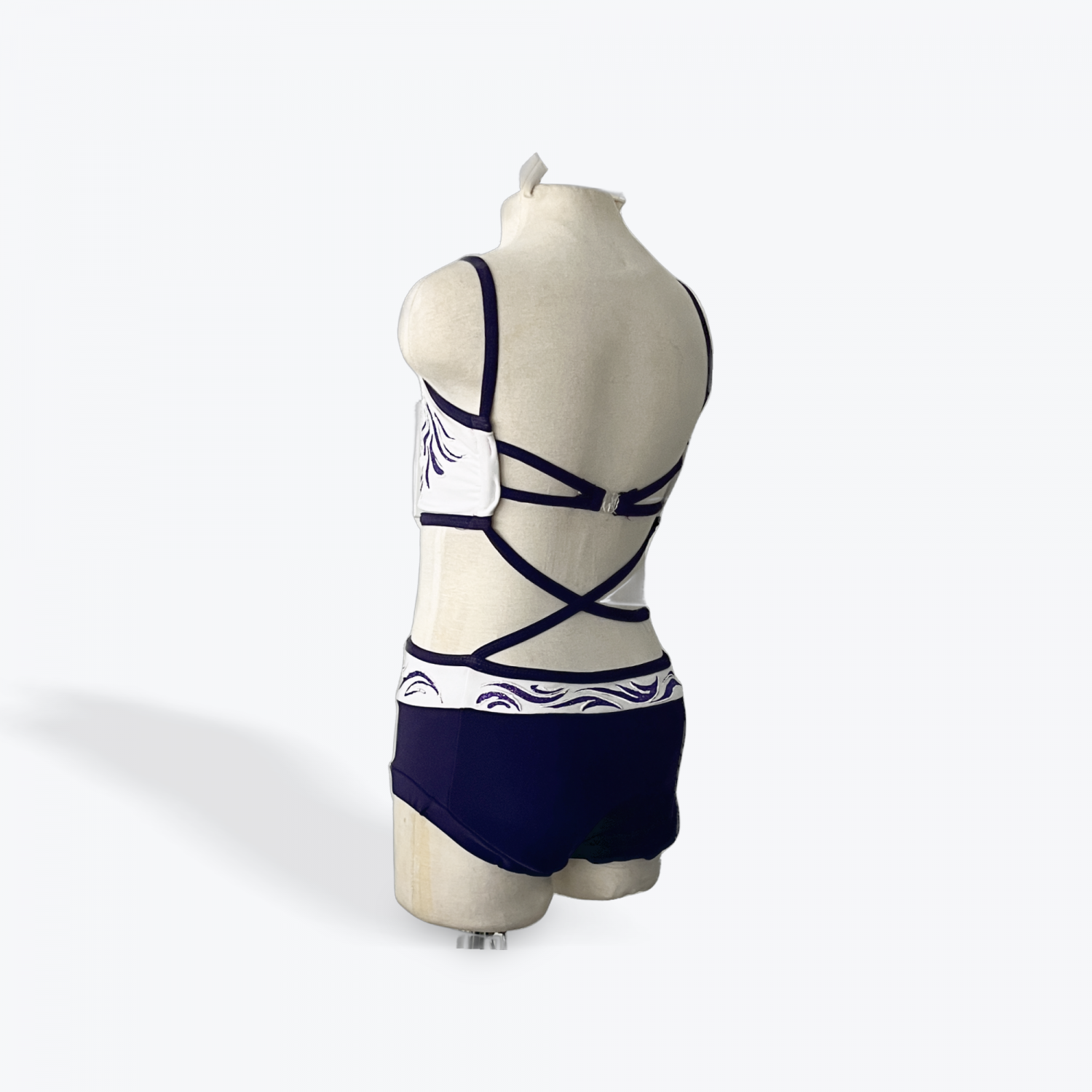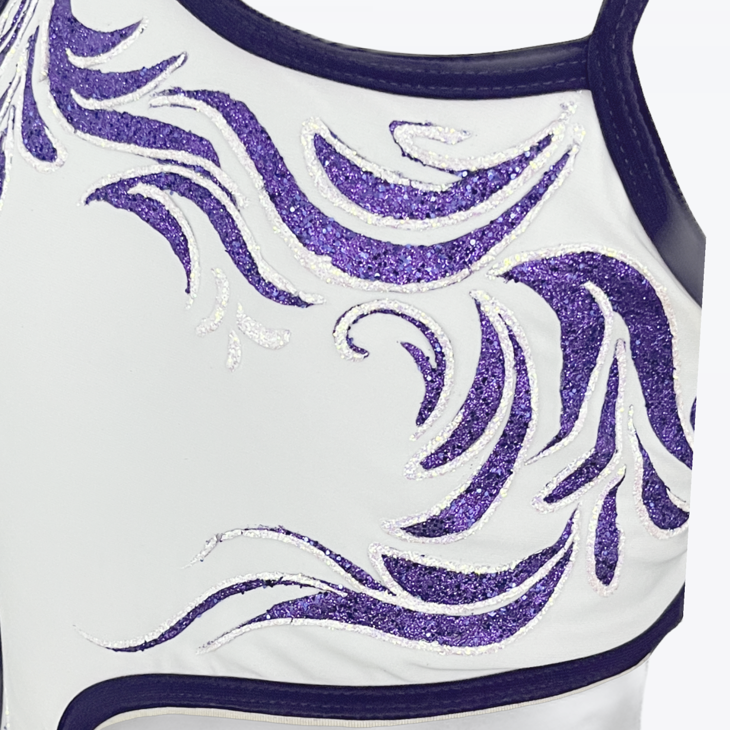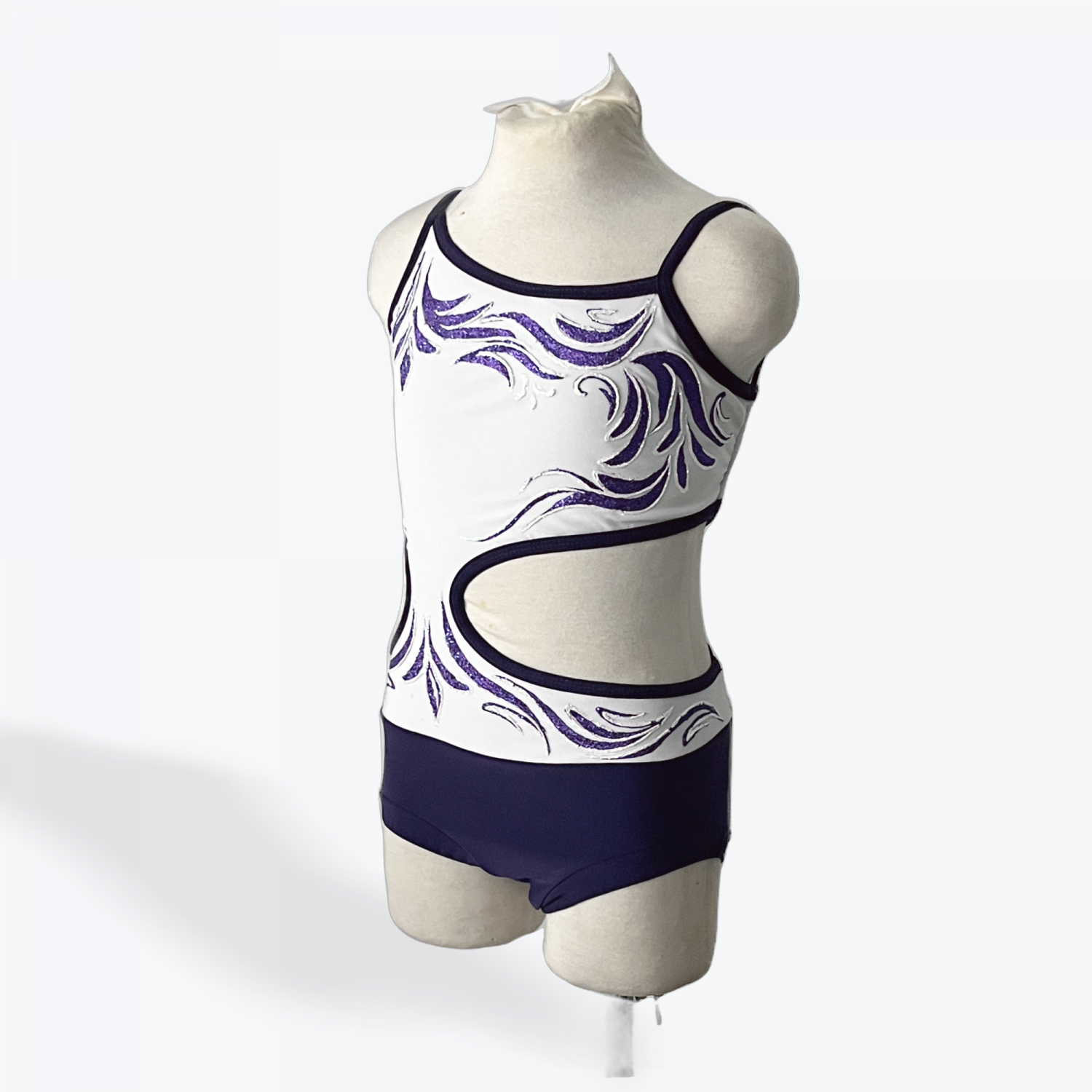 Stand out in this striking white and purple solo costume featuring bold purple glitter swirl detailing. The asymmetrical cut-out design and crisscross back straps add modern flair, while the clean lines create a powerful stage look. Comfortable shorts-style bottom ensures coverage and flexibility, making it ideal for contemporary, jazz, or open routines.